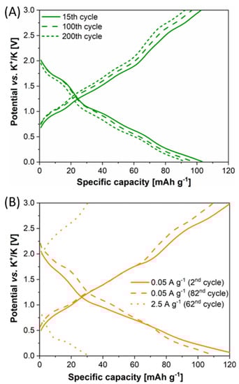 This initial irreversible capacity loss was mainly attributed to the formation of the SEI layer. Indeed, it has to be considered that we used a standard liquid electrolyte to make our results comparable with those present in the literature; moreover, the PIBs field has not yet defined an optimized electrolyte formulation (additives included) in the way it has already been established for LIBs, even if many studies are just starting to address this issue [52,53,54,55]. Upon cycling, specific capacity values stabilized and, when the current density was increased, these values slightly decreased, reaching 20 mAh g−1 at 5 A g−1. In a later stage, when the applied current was shifted back to the initial value of 0.05 A g−1, the cell fully recovered the initial specific capacity exceeding 100 mAh g−1, highlighting the great electrochemical behavior of the MoS2 electrode. When comparing the 100th and 200th cycles, the stability of our lab-scale cell is obvious, with an overall specific capacity retention of >97%. The stability of the electrochemical performance can also be noted in Figure 2A, in which charge/discharge profiles, i.e., potential vs. specific capacity curves, remain very close upon cycling, with a rather stable working potential window suggesting poor polarization phenomena. Figure 2B shows the charge/discharge profiles under the previously mentioned current regimes.