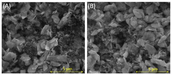 The morphology of the MoS2 electrodes was investigated before and after 150 charge/discharge cycles; moreover, it was also carried out to know more about the SEI layer formation in the first cycles. Since the cycling performances are stable after the first few cycles, it can be realistically stated that the SEI layer does not vary in composition and thickness during charge/discharge process; therefore, post mortem FESEM could be a potential technique to investigate its morphology. The FESEM micrograph of the fresh electrode is shown in Figure 3A. It highlights the particle size in the micrometer range (lower than 5 µm, as confirmed in the commercial product datasheet and as also found in other literature studies using this material). The morphology showed a layered geometry, clearly visible in the micrograph. In regards to the conductive additive, it resulted in quite a homogeneous distribution. On the other hand, the electrode obtained after cell disassembly was recovered and washed with the same solvent used for liquid electrolyte preparation (i.e., EC:DEC 1:1 v/v), with the aim of removing salts that would have compromised the quality of the images. The resulting micrograph (Figure 3B) shows similarities with those relative to the fresh electrode material. Indeed, MoS2 particles remained in the micrometric size range and the morphology of the surface did not show any relevant difference. This is rather noteworthy, since the prolonged insertion/disinsertion of large potassium ions in the MoS2-based anode could have damaged the electrode structure, as often occurs when studying anodes for post-lithium batteries [56,57].