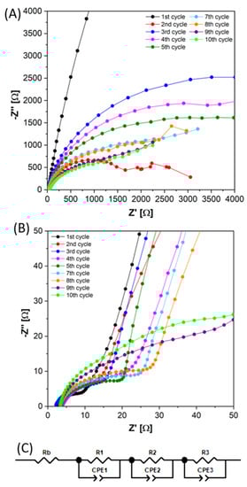 The forming stage was evaluated by recording the EIS spectra before and after the charge/discharge cycles. Figure 4A,B shows a first cycle profile typical of an electrode/electrolyte interphase that can be described—at first reading—by a semicircle and a straight line in the low-frequency region, which depicts the diffusion behavior; in any case, considering the slope quite different with respect to the theoretical 45°, it is not clearly excludable that the second part of the curve could be a wide semicircle. Starting from the second cycle, a depressed semicircle appeared at high and medium frequencies and another semi-circle was detected at the low-frequency region. Upon cycling, a straight line started to become evident, in particular at cycles 9–10. Overall, the shape of the EIS curves we recorded in a reproducible way is not so common for battery anodes; this will push us to carry out further studies, maybe coupled with in operando approaches to better clarify the occurring phenomena.