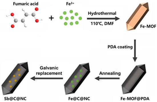 Lithium-ion batteries (LIBs) have been widely applied in commercial electronic devices (smartphones, laptops, etc.) and electric vehicles in recent years owing to their exceptional energy density and long cycle life [1,2,3]. However, for the wider application of LIBs, it is necessary to spare no effort to boost their energy density and improve their cycle life. Graphite, a widely used anode, because of its low theoretical specific capacity (372 mAh g−1) and inferior safety problems (0.1 V vs. Li/Li+), has gradually failed to meet the requirements for high-energy density LIBs. Therefore, researchers have focused on discovering and designing various anode materials to replace traditional graphite. Antimony (Sb), with a high specific capacity (660 mAh g−1) and safe intercalation potential (0.8 V vs. Li/Li+), is the most promising anode for next-generation high-energy LIBs [4,5,6,7,8,9]. However, current Sb-based anodes undergo large volume variation (over 150% volume increase via the formation of Li3Sb) during the charge–discharge process, which inhibits the practical application of Sb anodes in LIBs. Furthermore, such a huge volume expansion causes the serious cracking of the active materials and an unstable solid electrolyte interphase (SEI), resulting in a rapid decrease in specific capacity and a short cycle life [10,11,12,13,14]. Therefore, to inhibit volume expansion, various researchers focused their attention on designing Sb-based alloys with Sn, Zn, Bi, Ni, Co, Cu, and other metallic elements [15,16,17,18,19,20,21], and combined with conductive carbon materials [10,22,23,24,25,26,27,28,29,30,31]. In detail, the introduction of metallic elements, especially nonelectroactive elements with relatively high atomic mass, provides a buffer for the volume variation, but decreases the integral energy density. However, the carbon-coating layer not only buffers the volume variation of Sb during the charge and discharge process, but also provides additional sites for the insertion of lithium ions. At the same time, the addition of nitrogen-doped carbon (NC) can introduce defects and improve electronic conductivity [32,33,34]. Dopamine, a special small organic molecule, can self-polymerize onto the surface of active materials in a particular solution, forming a uniform polydopamine (PDA) coating layer, and then pyrolyze to form a uniform N-doped carbon-coated shell. With the inertness of the original bulk generating poor Li+ diffusion kinetics, designing nanostructured Sb electrodes is a feasible method to settle these issues. Metal–organic-framework MOFs are porous materials formed by metal-ion and organic ligands through self-assembly and coordination bond linkage, which were first defined by Yaghi et al. [35] in the 1990s, have recently attracted considerable attention. Numerous studies showed that MOFs can combine metallic elements with a carbon framework, which is an effective strategy to encapsulate active materials into a conductive network and confine the growth of active materials. Facile galvanic replacement was also confirmed as an effective strategy for synthesizing nanomaterials and preventing the growth of active particles [36,37].