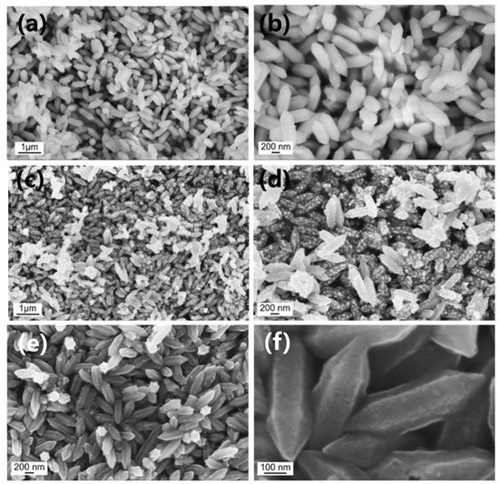 The microstructure of the Fe-MOF, Fe@C, Fe@C@NC, Sb@C, and Sb@C@NC was characterized with scan electron microscopy (SEM). Figure 2a,b show the SEM images of Fe-MOF, which displayed robust spindle-structured structures. Figure 2b shows the high-magnification SEM image of Fe-MOF, which demonstrates that the middle part of the Fe-MOF was a prism structure, and two terminals were cone-shaped. The SEM results reveal that the length and width of the Fe-MOF were about 800 and 250 nm, respectively. Figure S1 (Supplementary Materials) and Figure 2c,d are the SEM results of the Fe@C and Fe@C@NC, respectively. Figure S1 demonstrates that the Fe@C maintained a nanorod structure that was similar to the morphology of Fe-MOF. The high-magnification result (Figure S1b) shows that the surface of the Fe@C nanorods was rough and accompanied by the aggregation of nanoparticles. Therefore, to inherit the spindle structure of Fe-MOF well, PDA was in situ polymerized on the surface of Fe-MOF and then pyrolyzed to form a double-layer coating. Figure 2c,d show the well-preserved Fe@C@NC spindle structure of Fe-MOF, which was composed of prisms and cones, and the size of Fe@C@NC, which were well-consistent with the Fe-MOF. The above SEM results reveal that the structure of Fe-MOF was well-inherited during the pyrolytic procedure by coating with PDA. Figure S2 (Supplementary Materials), and Figure 2e,f, exhibit the morphology of the Sb@C and Sb@C@NC after galvanic replacement. The morphology was without obvious change during the galvanic replacement process. Different from Sb@C, the structure of Sb@C@NC retained the spindle-structured Fe-MOF, which further reveals that the double-carbon modification enhanced the integral structure stability well.