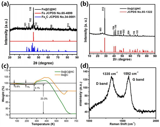 XRD results of (a) Fe@C@NC and (b) Sb@C@NC; (c) TG curves of Sb@C and Sb@C@NC. (d) Raman spectrum of Sb@C@NC.