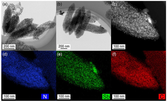 (a,b) TEM images of Sb@C@NC. (c) HAADF TEM image. (d–f) TEM EDS element mapping signals of Sb@C@NC.