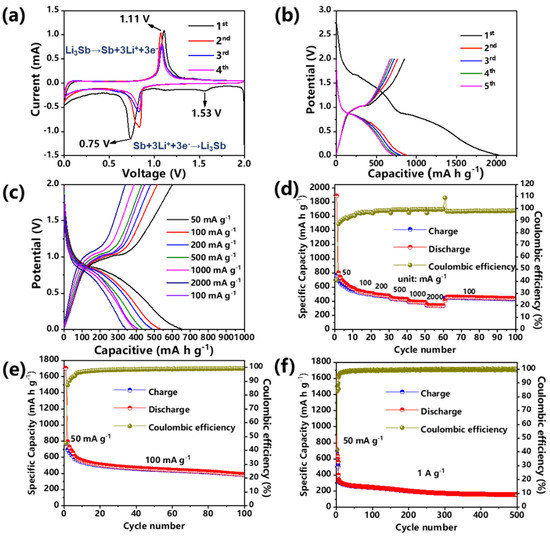 where a and b are empirical parameters. Normally, the b-value is equal to 0.5, representing that the charging and discharging process is completely controlled by diffusion, and the b-value is 1 representing a capacitance-dominated process. As shown in Figure 5b, the b-values of anodic and cathodic peaks were 0.595 and 0.505, respectively; both were over 0.5, indicating fast kinetics owing to the pseudocapacitive effect. Figure 6c and Figure S9 (Supplementary Materials) exhibit the capacitive contribution (the blue curves) and the total current contribution (the red area). The ratios of pseudocapacitive contribution (Figure 6d) were 37.6%, 53.8%, 62.0%, 69.3%, 74.4%, and 79.7% at the scan rates of 0.1, 0.2, 0.4, 0.7, 1.0 and 1.5 mV s−1, respectively, which reveals that the pseudocapacitive effect occupied a high ratio to the total capacity [41]. Lastly, the rate capability of the current spindle-structured Sb@C@NC with other previously designed Sb-based materials for LIBs is simply summarized in Table S1. The current spindle-structured Sb@C@NC anode also emerged with distinct superiority in specific capacity and cycling capability [43,44,45,46,47,48,49]. The advantages of these spindle-structured Sb@C@NC can be summarized as follows: the unique porous spindle-structured structure of Sb@C@NC endows sufficient interspace to inhibit the volume fluctuations while the ions reciprocate insertion/desertion. Moreover, the Sb@C@NC anodes with porous features favor the infiltration of electrolytes, and boost electron and ion transportation. Lastly, the double-carbon-modified framework can effectively improve electrical conductivity and maintain structural stability, thereby achieving good electrochemical properties.