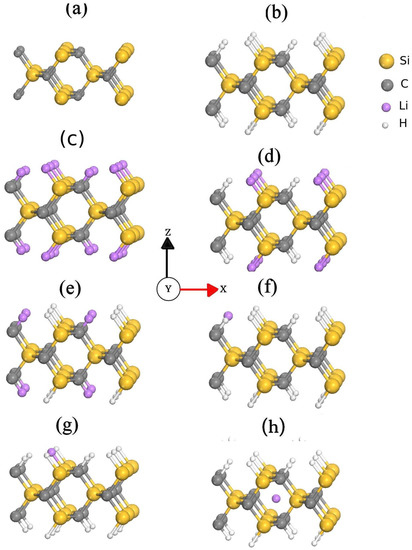 In this work, the monolayers of 3C-SiC oriented in the crystallographic direction (1 1 0) were modeled by the supercell scheme of an otherwise perfect bulk SiC crystal [25]. The thickness of these monolayers is 3.07 Å, as shown in Figure 1. The monolayers are considered to be periodic in the x and y axes, while confined in the z direction. To avoid the interaction between their replicas, we have considered a slap distance of more than 10 Å along the z-direction. The lattice parameters a = 8.69, b = 6.14, and c = 18.07 Å. In Figure 1a, we observed that the monolayers of Si and C atoms form on the top and bottom surfaces, which is why they are called symmetric monolayers. We have considered different passivation schemes over both surfaces to conform to the monolayer. First, we considered the bare case (Figure 1a), which is called pristine, then the surface was passivated with hydrogen atoms (Figure 1b), defined as full-H, leading to Si–H and C–H bonds. Then, the H atoms were replaced with lithium atoms, resulting in Si–Li and C–Li bonds (Figure 1c), which are referred to as Full-Li. To better understand the effects of lithium on the electronic properties, mixed passivations are considered, which consist of passivating the carbon atoms with hydrogen and the silicon with lithium (Figure 1d) and vice versa (Figure 1e). These passivations are referred to as CH+SiLi and CLi+SiH, respectively. Another mixed passivation consists of replacing only one H atom with Li in carbon or silicon atoms, respectively. These passivations are referred to as H+1LiC and H+1LiSi (Figure 1f,g). Finally, in the full-H case, we introduced only one lithium, which is denoted as H+Li. This lithium was placed in the center of the hexagon of the monolayer (Figure 1h). We used the density functional theory (DFT) described in the code SIESTA to perform all calculations [26]. The wave functions were represented with a double zeta basis set and polarization orbitals. The correlation of the electronic exchange energy was treated with the RPBE generalized gradient approximation (GGA).