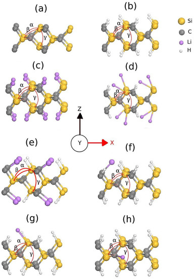 Figure 2 shows the 3C-SiC (1 1 0) monolayers with different passivation schemes after complete geometry optimization. A comprehensive review of all bond lengths and internal angles in all structures was then performed. It is found that the structure that undergoes the most structural changes in its interior angles is the original structure, which has different angles with = 113.74, = 113.7 and = 89.72. These results are consistent with those of Bernd et al. [22] who found that the C surface atoms are displaced outward and the Si surface atoms are displaced inward. This relaxation leads to a non-negligible deformation of the first surface layer. The surface hydrogenation does not cause significant changes in the structure, the internal angles are 109.3, while the angles formed by the hydrogen atoms bonded to the carbon and silicon atoms are 108.95 and 110.5, similar results have been reported previously [28,29]. When the hydrogen atoms are replaced by lithium, the internal angles are 109.3 (as reported in Table 2) and the angles formed by the lithium bonded to the carbon and silicon atoms are 109.2 and 109.5, respectively. Analysis of electron density (not shown) and Voronio charges suggests that there are no interactions other than those shown in Figure 2c, although the Li–Li, Si–Li, or C–Li interaction distances are very similar to those reported previously. In the passivation scheme CH+SiLi [Figure 2d], the internal angles show a slight decrease in their values compared to the hydrogenated case ( = 106.1, = 107.4), while = 109.34 remains. In addition to the internal deformation, two different Si–Li angles are observed in this passivation (86.7 and 124.5). These findings state that the lithium atoms lead to a deformation of the structure. Similar observations have been made experimentally in bulk Si, where lithium causes an amorphization of the structure at room temperature [30,31].