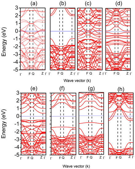 It can be observed that with Full-H passivation, the band-gap opens and becomes direct with a value of E = 2.9 eV (Figure 3b). On the other hand, Pristine, Full-Li, CH+SiLi and H+Li (Figure 3a,c,d,h) produces a metallic behavior. The passivation scheme CH+SiLi Figure 3d causes an indirect decrease in the band-gap energy with a value of 0.87 eV. Finally, an almost flat state below the Fermi level is observed in the H+1LiC and H+1LiSi passivations, similar to the states produced by p-doping. These states have already been observed in SiC nanowires [28].