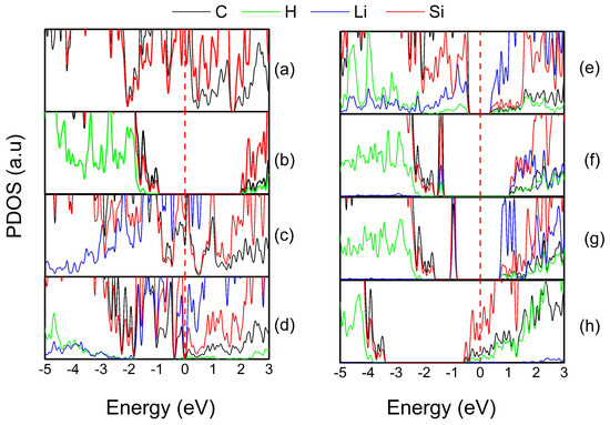 Partial Density of States of 3C-SiC (1 1 0) surfaces. (a) Pristine, (b) Full-H, (c) Full-Li, (d) CH+SiLi, (e) CLi+SiH, (f) H+1LiC, (g) H+1LiSi, (h) H+Li.