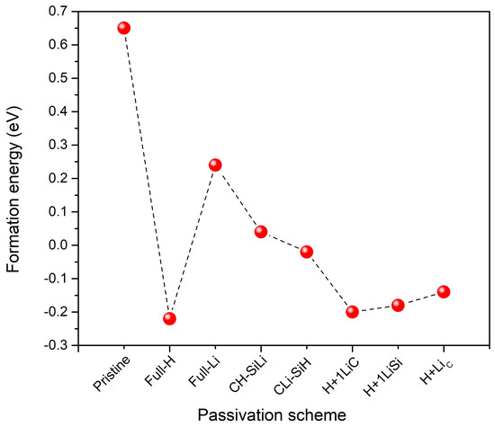 Figure 5 shows the formation energy versus the passivation scheme considered in this work. In the pristine monolayer, we have unpassivated atoms on the surface, which means that it is an unstable structure. Since the surface-to-volume ratio is high, it is also possible that the final energy depends on the reactivity of the atoms on the surface, which could have some interactions due to the unpassivation, which is the reason for a positive value of this energy. We confirm that for the full-H monolayer, where we passivated all dangling bonds with H atoms, the surface energy decreases and the value of the formation energy also decreases. By this, we found that the passivation schemes Full-H is the most stable configuration followed by H+1LiC, H+1LiSi, H+Li and CLi+SiH due to they show negative formation energy, with values of −0.22, −0.2, −0.14 and −0.02 eV, respectively. While the most unstable configurations are the pristine, Full-Li and CH-SiLi with positive formation energy with values 0.65 eV, 0.24 eV and 0.04 eV, respectively, Supplementary Material S1 (see Table S1 and Figure S1 for details). These results suggest that lithium affects the stability of the system, especially if lithium is linked to silicon atoms.