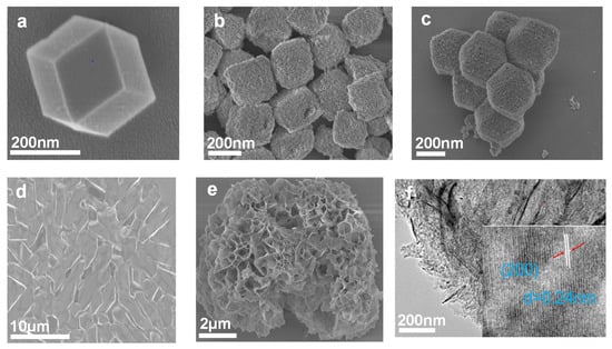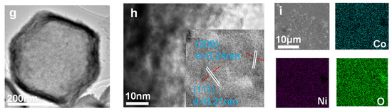 Figure 1a is the scanning electron microscope (SEM) picture of ZIF-67. It can be observed that the formed ZIF-67 template exhibits a regular dodecahedron morphology. NiCo-LDH(B) (Figure 1b) constructed with nanosheets presents a hollow nano-box shape with uniform size. The finally transformed CoNiO2(B) in Figure 1c has almost the same regular polyhedral morphology as ZIF-67. By thermal removal of crystal water in NiCo-LDH nano-flakes (NiCo-LDH(F)) (Figure 1d) synthesized by hydrothermal procedure, CoNiO2(F) is also prepared as the comparative sample, whose two-dimensional morphology is inherited from NiCo-LDH(F), as shown in Figure 1e. Transmission electron microscopy (TEM) was employed to further analyze the morphology and crystal structure of the transition metal oxide nano-boxes and nano-flakes. The TEM image of CoNiO2(F) (Figure 1f) verifies the perfect crystallinity, and its inset exhibits distinct lattice fringes with a spacing of 0.24 nm corresponding to the (200) plane of CoNiO2. The transmission electron microscope image of CoNiO2(B) (Figure 1g) illustrates the hollow interior. Figure 1h is a high-magnification TEM image of CoNiO2(B), which indicates two set lattice fringes, with interplanar spacings of 0.24 and 0.21 nm, which correspond to the (200) and (111) planes of the CoNiO2 compound crystal, respectively. Figure 1f is the EDS mapping of CoNiO2(B), which displays the uniform elemental distribution of the Ni, Co, and O components.