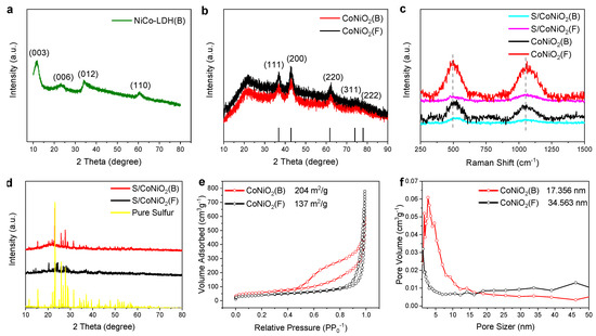 The result of XRD, Raman and BET; (a) X-ray diffraction pattern of NiCo-LDH(B). (b) XRD pattern of CoNiO2(B) and CoNiO2(F). (c) Raman spectra of CoNiO2(B) and CoNiO2(F). (d) XRD pattern of S/CoNiO2(B) and S/CoNiO2(F). (e) The isotherms of N2 adsorption-desorption and (f) the distributions of pore sizes in CoNiO2(B) and CoNiO2(F).