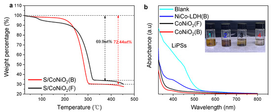 Sulfur is injected into the host by melt-diffusion, and the mass proportion of sulfur was obtained from a thermogravimetric analysis (TGA) measurement. Due to sublimation of sulfur, the TGA curve has a large weight drop in the temperatures ranging from 200 °C to 350 °C, and the weight loss reflects the mass percentage of the loaded sulfur, as displayed in Figure 3a. S/CoNiO2(B) has a higher sulfur content (72.4 wt%) than S/CoNiO2(F) (69.9 wt%). This can be attributed to the large internal storage capacity of the hollow architecture of the CoNiO2(B) material. In order to characterize the lithium hexasulfide-adsorption of the materials, 8 mg of the obtained NiCo-LDH(B), CoNiO2(F), and CoNiO2(B) were respectively soaked into 4 mL of 5 mM Li2S6 solution with a mixture solvent of DOL and DOE (volume ratio V/V = 1/1); their corresponding containing bottles were labeled as bottle 2, bottle 3, and bottle 4, while the bottle containing pure Li2S6 solution was labeled as bottle 1. All the solutions rested for 10 h. Figure 3b shows the results of the visualized static Li2S6 adsorption. It is clearly observed that bottle 4 has the highest transparency, followed by bottle 3, and finally bottle 2. Among them, the solution containing CoNiO2(B) is almost colorless, indicating that CoNiO2(B) has an excellent adsorption capacity for PSs. UV-vis spectra also confirmed the same conclusion, as the solution containing CoNiO2(B) has the weakest absorption peak at the characteristic wavelength position of LiPSs [35].