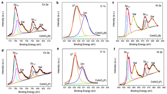 XPS spectra of CoNiO2(B) and CoNiO2(F). (a) Co 2p, (b) O 1s, and (c) Ni 2p XPS spectra of CoNiO2(B). (d) Co 2p, (e) O 1s, and (f) Ni 2p XPS spectra of CoNiO2(F).