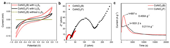 During the charging and discharging process, a rapid conversion of PSs can significantly minimize the shuttle effect. The effects of CoNiO2(B) and CoNiO2(F) on the liquid–liquid and solid–liquid conversion of PSs was measured by a symmetric cell. The CoNiO2(B) symmetric cell without Li2S6 in Figure 5a produced nearly zero capacitive current, while the CoNiO2(B) symmetric cell with Li2S6 electrolyte exhibited more than twice the redox current than CoNiO2(F), indicating that CoNiO2(B) vigorously accelerates the redox kinetics of the liquid–liquid conversion of PSs [44]. EIS spectra (Figure 5b) showed that CoNiO2(B) symmetric cells exhibit lower charge transfer resistance (Rct), further confirming that CoNiO2(B) could promote redox reaction kinetics of PSs. The deposition of Li2S represents the conversion of soluble PSs to insoluble Li2S (liquid–solid). As exhibited in Figure 5c, the onset of Li2S deposition is located at the upward inflection point of the potentiostatic discharge curve. The initial deposition time of Li2S on CoNiO2(B) is 897 s, which is earlier than that of CoNiO2(F) at 1831.2 s. The peak current of CoNiO2(B) is 0.430 A g−1, which is larger than the 0.211 A g−1 of CoNiO2(F). The shorter Li2S deposition time and the larger peak current confirm that CoNiO2(B) can efficiently boost the transition of soluble PSs to solid Li2S [45]. The excellent kinetic promotion of CoNiO2(B) is predominantly attributed to the increased active site density and shortened path lengths for mass and ion transportation. Furthermore, the tensile strain that resulted from hollow architecture, as discussed above, is additionally beneficial for improvement of catalytic performance. Liu et al. [46] confirm that slight lattice deformation aroused from the tensile strain will result in lengthened chemical bonds, which will exert adjustment on the crystalline electronic structure. Wang et al. [47] demonstrated that, with tensile strain, the d-band center of the transition metal atom in the active sites shifts toward the Fermi level, thus improving the chemical adsorption and catalytic conversion of the PSs for further performance enhancement of Li-S batteries.