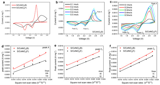 A coin battery was assembled for the cyclic voltammetry (CV) cycle testing to inspect the electrochemical reactivity of the Li-S battery. The CV curves of the S/CoNiO2(B) and S/CoNiO2(F) electrodes were examined at a scanning rate of 0.1 mV/s, and the results are displayed in Figure 6a. Within the voltage range of 1.7–2.8 V, there are two cathodic peaks (2.27 V, 2.01 V), which reflect the reaction that occurs during discharge—sulfur is reduced to soluble PSs, and soluble PSs are further reduced to solid state lithium sulfide. The anodic peak (2.42 V) signifies the oxidation of dilithium sulfide to sulfur during charging. The S/CoNiO2(B) electrode exhibits a significantly larger peak current and narrower peak width, which indicates that CoNiO2(B) enhances the charge–discharge reaction kinetics of PSs. In addition, charge–discharge reaction kinetics can be further analyzed by CV. The results of CV at five different scan rates are shown in Figure 6b–c. As the Randles–Sevcik principle points out, with the square root of the scanning rate and the peak current of the CV curve as variables, the slope of the fitted curve between them reflects the Li+ diffusion coefficient [48]. In general, the higher the slope, the faster the diffusion of Li+. Figure 6d–f show that the slopes of the fitted curves for the S/CoNiO2(B) cathode at peak A, peak C1, and peak C2 are numerically larger than those for the S/CoNiO2(F) cathode. The results verify that CoNiO2(B) provides more channels and reduced path lengths for mass and ion transportation in the redox reaction.