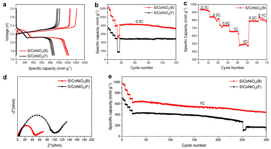 All assembled coin batteries were aged at 50 °C for 48 h for activation before charge and discharge. Figure 7a shows galvanostatic charge–discharge profiles of the batteries with S/CoNiO2(B) and S/CoNiO2(F) cathodes for the initial three cycles at 0.05 C. The S/CoNiO2(B) cathode exhibits one plateau near 2.39 V related to sulfur oxidation and two stages at 2.26 V and 2.10 V correlated with sulfur reduction, while the S/CoNiO2(F) cathode exhibits one oxidation peak at 2.40 V and two reduction peaks at 2.24 V and 2.10 V. The charging–discharging overpotential of S/CoNiO2(B) is 0.13 V, lower than that of S/CoNiO2(F) (0.16 V), which denotes slighter polarization of the CoNiO2(B) host. The discharge specific capacities of S/CoNiO2(B) corresponding to the first, second, and third cycles are 1232 mAh g−1, 1215 mAh g−1, and 1190 mAh g−1, respectively, which are all larger than S/CoNiO2(F) (894 mAh g−1, 869 mAh g−1, 849 mAh g−1). The 0.5 C rate cycling characteristics of the two type cathodes were revealed in Figure 7b. The first 25 cycles are conducted at current density of 0.05, 0.1, 0.2, 0.5 and 1 C. The first discharge specific capacity of the S/CoNiO2(B) cathode decreased to 822 mAh g−1, while a stable value of 730 mAh g−1 remained after 150 cycles, which is 50% greater than the S/CoNiO2(F) cathode (486 mAh g−1). Figure 7c further reveals the rate performance of the S/CoNiO2(B) cathode, which delivered an initial specific capacity of 931.2 mAh g−1, 836.72 mAh g−1, 736.82 mAh g−1, 655 mAh g−1, and 502.1 mAh g−1 at a current density of 0.1, 0.2, 0.5, 1, and 2 C, respectively. When the current density suddenly decreased from 2 C to 0.2 C or 0.1 C, the reversible specific capacity can still be maintained at 757 mAh g−1 and 807.441 mAh g−1, respectively.