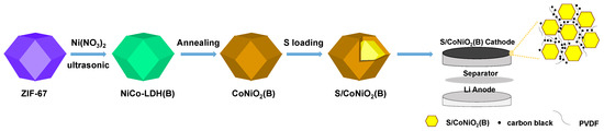 The preparation process of the S/CoNiO2(B) cathode is schematically illustrated in Scheme 1. First, ZIF-67 is used as a sacrificial template. When nickel nitrate is added, ZIF-67 is etched by H+, which is produced by the hydrolysis of Ni2+. Then, the −NH2 falls off from ZIF-67 under ultrasonic vibration and hydrolyzes to generate OH−, which accelerates the internal collapse of ZIF-67 and causes Co2+ to move outward. Both free Co2+ and Ni2+ bind with OH− and co-deposit on the surface of the ZIF-67 framework to form NiCo-LDH nanosheets [33], which finally stack together to constitute a hollow NiCo-LDH nano-box (NiCo-LDH(B)). With further annealing, NiCo-LDH(B) is transformed into CoNiO2(B). Sulfur is injected into CoNiO2(B) by the melt-diffusion method; finally, formed S/CoNiO2(B), carbon black, and PVDF are mixed as the cathode to assemble the Li-S battery.