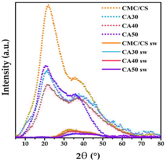 - Uyanga, K.A.; Daoud, W.A. Carboxymethyl cellulose-chitosan composite hydrogel: Modelling and experimental study of the effect of composition on microstructure and swelling response. Int. J. Biol. Macromol. 2021, 181, 1010–1022. [Google Scholar] [CrossRef]