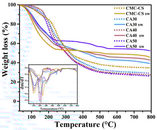 - Corazzari, I.; Nisticò, R.; Turci, F.; Faga, M.G.; Franzoso, F.; Tabasso, S.; Magnacca, G. Advanced physico-chemical characterization of chitosan by means of TGA coupled on-line with FTIR and GCMS: Thermal degradation and water adsorption capacity. Polym. Degrad. Stab. 2015, 112, 1–9. [Google Scholar] [CrossRef]