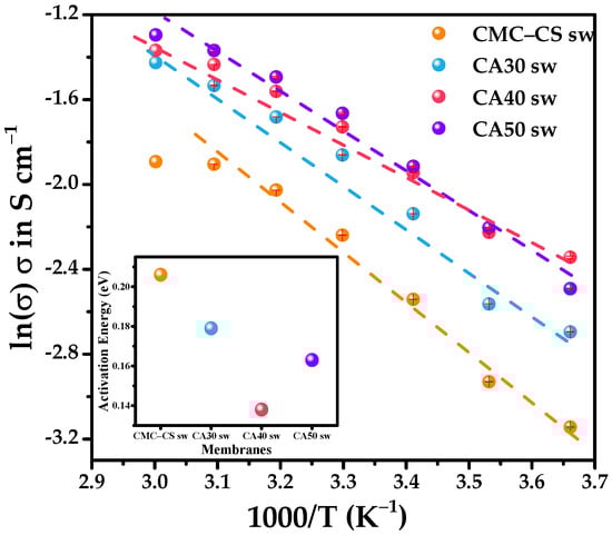 3.5.1. Influence of the CA Content on the Ionic Conductivity