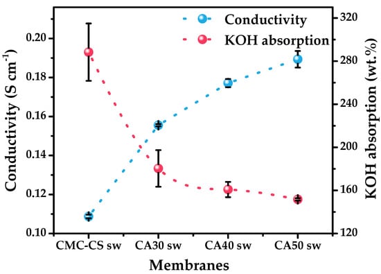 | Electrolyte | KOH Absorption (%) | Ea (eV) | σ (S∙cm−1) |