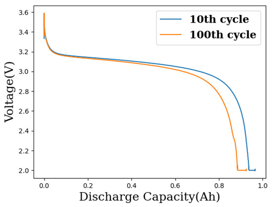 Difference in discharge capacity as a function of voltage between cycle 10 and cycle 100 for an exemplary cell.