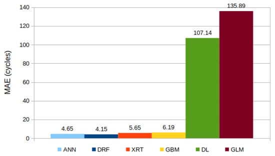Secondly, the algorithm H2O AutoML was used to compare different ML models. The dataset applied was the one that resulted in the best prediction in the previous ANN analysis (new dataset with additional columns). The MAE was the metric on which the comparison was based, and the results are depicted in Figure 2. The best models were DRF, XRT, and the GBM, with MAEs of , and cycles, respectively. The best ANN analysis produced an MAE of cycles. Meanwhile, DL and the GLM returned errors substantially higher than the ANN reference value. An additional advantage of these algorithms is that they are significantly more agile than ANNs. The ANN model performed training and prediction in approximately 15 min, while the new methods took only seconds.