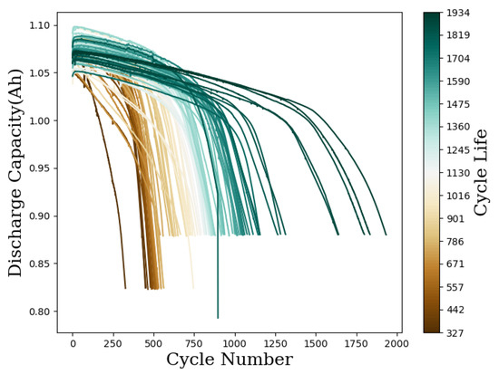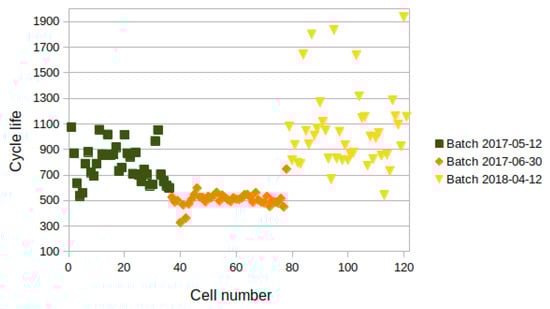 The cycle lives of all analyzed cells are depicted in Figure 3. There were different distributions of lifetimes for the three batches, where the highest lifetimes belonged to batch “2018-04-12” and the shortest to batch “2017-06-30”. The batches differed in the resting times while cycling, as described in the Section 2. One observation that can be made is that the cells with the shortest cycle lives belonged to the batch with the longer resting times. Longer relaxation times have already been linked to higher impedance measurements in experiments [55]. A similar correlation seemed to happen in the data from Severson et al. [6].