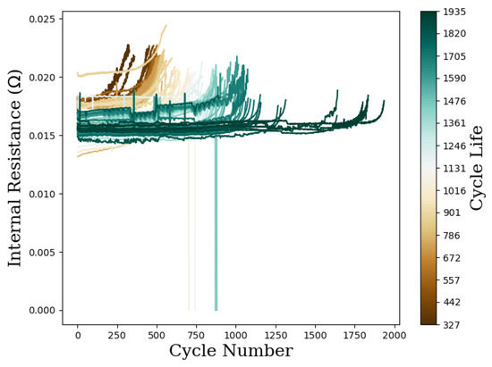 Additionally, the discharge capacities of the analyzed cells can be seen in Figure 4 as well as the internal resistance in Figure 5. The color set-up indicates the lifetimes of the cells. Cells with higher initial internal resistance ended up with shorter lifetimes. These were mostly the cells belonging to the batch “2017-06-30”, which was the batch with longer resting times. Another observation is that those cells from batch “2017-06-30” were cycled until reaching 75% nominal capacity, while the remaining two batches were cycled until 80% nominal capacity. Therefore, the cells were easy to spot when the discharge capacity was plotted, as their curves were slightly longer.