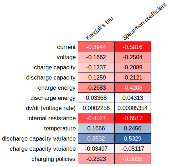 To better analyze the input features, the importance of the variables for the XRT model was investigated using two different models: Kendall’s tau and the Spearman coefficient. The results are shown in Figure 6 and Figure 7. A score which tends toward zero indicates that no correlation is present. Meanwhile, a score tending toward 1 or −1 indicates a strong correlation between the input variables and the cycle life. The sign denotes the direction of the correlation. A negative coefficient means that the variables are inversely related [52]. In this analysis, it can be seen that the discharge energy, voltage rate and charge capacity variance were the features with the smallest importance coefficients, meaning that they were the least important ones. On the other hand, the features of the current, internal resistance and discharge capacity variance appeared to be the most relevant ones.