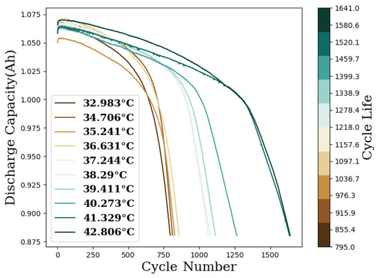Discharge capacities of exemplary cells for different final testing temperatures. All cells started cycling with similar temperatures, but cells with longer cycle lives presented higher final testing temperatures.