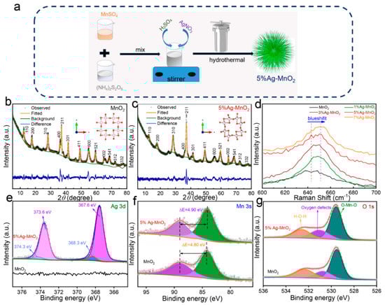 (a) Schematic illustration for the synthetic process of 5%Ag-MnO2. Rietveld refinement results of (b) pure MnO2 and (c) 5%Ag-MnO2, and corresponding crystal structures are presented in the inset. (d) Raman spectra of pure MnO2 and Ag-doped MnO2. High-resolution (e) Ag 3d, (f) Mn 3s, and (g) O 1s XPS spectra of pure MnO2 and 5%Ag-MnO2.