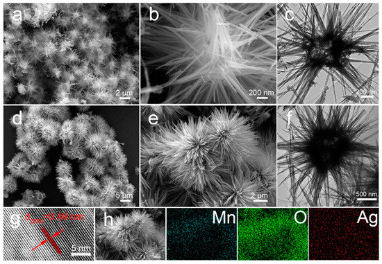 (a,b) FESEM image of pure MnO2. (c) TEM image of pure MnO2. (d,e) FESEM image of 5%Ag-MnO2. (f) TEM image of 5%Ag-MnO2. (g) High-resolution TEM image of 5%Ag-MnO2. (h) EDS elemental mapping images of every element in 5%Ag-MnO2.