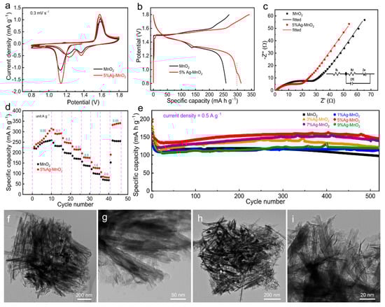 (a) CV curves at a scan rate of 0.3 mV s−1, (b) GCD curves at a specific current of 0.05 A g−1, (c) EIS spectra, and (d) rate performances of ZIBs based on pure MnO2 and 5%Ag-MnO2. (e) Long-term cycling performance at a specific current of 0.5 A g−1 for the MnO2 doped with different amounts of Ag. TEM images of 5%Ag-MnO2 after being cycled at 0.5 A g−1 for (f,g) 50 and (h,i) 500 cycles.