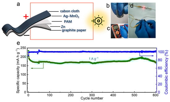 In addition, a flexible quasi-solid-state ZIB is successfully assembled using 5%Ag-MnO2@graphite paper as cathode, Zn@cabon cloth as anode, and polyacrylamide as electrolyte (Figure 5a). As shown in Figure S10, the Zn particles are uniformly deposited on carbon cloth, and the XRD pattern of the electrode can be assigned to pure Zn metal (PDF#87-0713), indicating successful electrodeposition of Zn metal on carbon cloth without any impurities. The quasi-solid-state ZIB shows good flexiblity, which can be blended into different shapes, as shown in Figure 5b. The flexible ZIB has a high open circuit potential to 1.57 V (Figure 5c). As shown in Figure 5d, our quasi-solid-state ZIB can light a red light-emitting diode (LED) indicator under bending. Meanwhile, the flexible quasi-solid-state ZIB exhibits excellent cycling performance with a specific capacity of 171 mA h g−1 and nearly 100% of coulombic efficiency maintained at 1 A g−1 over 600 cycles (Figure 5e), which is better than most of other flexible quasi-solid-state aqueous ZIBs as shown in Table S3.