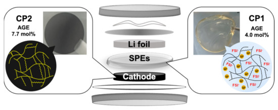 The starting copolymer with 4.0 mol% of AGE was used to make CP1 as an SPE with different LiFSIs of 40, 60, 80, and 100 mol%, and the lithium ions to monomer units of the carbonate groups were 0.4, 0.6, 0.8, and 1.00, respectively. Then, the initiator AIBN was introduced and all substances were dissolved in acetonitrile solution. The mixture was left in a vacuum oven at 60 °C for 48 h for the crosslinking process, as shown in Scheme 1. All adjustments were performed in an Ar-filled box. Afterwards, the CP1-based SPE was dried in the vacuum oven for 25 h before use.