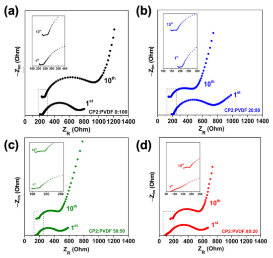 Nyquist plots after the first and tenth cycles of CP2:PVDF at the following ratios: (a) 0:100, (b) 20:80, (c) 50:50, and (d) 80:20.