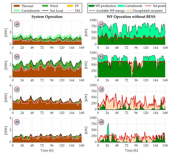 (1) System and (2) WF operation for indicative weeks: (a) low demand and high wind potential, (b) high demand and high wind potential, (c) high demand and low wind potential, (d) low demand and low wind potential.