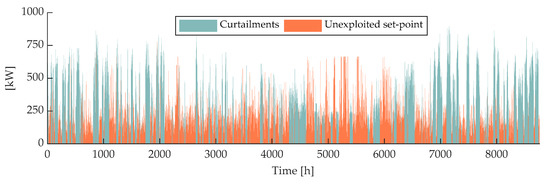 Annual timeseries of curtailments and the unexploited set-point in the no BESS scenario.
