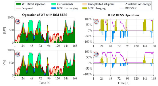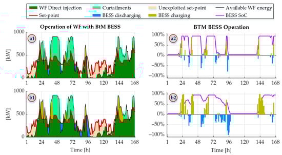 The operation of the combined WF–BESS facility is presented in Figure 4 and Figure 5 for indicative weekly intervals and different BESS configurations. In Figure 4, the significance of the energy capacity (duration) of the storage for the effective mitigation of curtailments becomes clear; while the 6 h BESS achieves the improved exploitation of curtailed wind energy compared to the 1 h BESS, it is still evident that an even larger storage capacity would be needed to effectively eliminate rejected wind energy due to the fact that wind curtailments take place over prolonged time intervals, as already noted.