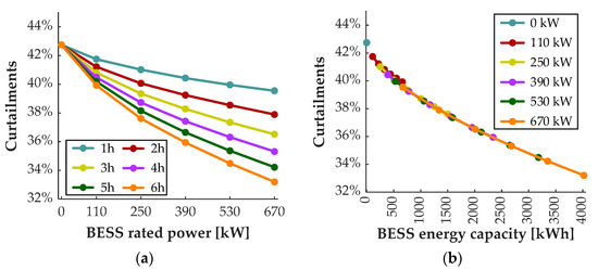 Annual wind energy curtailments as a function of BESS (a) rated power and (b) energy capacity, for different BESS configurations.