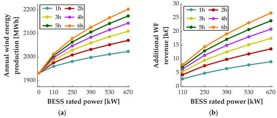 The corresponding increase in wind energy output is presented in Figure 7a, while Figure 7b presents the additional revenue of the WF, assuming a FiT of EUR 98.77/MWh, as calculated in Section 5.1. Even for the largest BESS (670 kW/6-h), the economic benefit for the wind producer does not exceed EUR 30 k per annum.