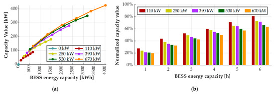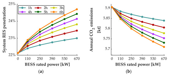 Figure 6 shows the reduction in wind power curtailments due to the introduction of storage as a function of BESS rated power (Figure 6a) and energy capacity (Figure 6b). As Figure 6b indicates, the energy capacity of storage is the decisive factor for wind curtailments reduction. A reduction of up to ~22% can be achieved in the level of spilt wind energy, with a corresponding increase in wind energy yield; however, curtailments remain high despite the integration of storage; even for the largest configuration examined (670 kW/6-h), they reach 33.2% (1121 MWh) of the annually available wind energy. The storage capacity needed to fully exploit available wind energy would be unrealistic and infeasible. For instance, to reduce curtailments below 5% of the available wind production, a 670 kW BESS with a duration of approximately 570 h would be required.