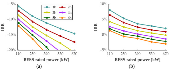 IRR of BESS investment (a) without and (b) with considering additional revenue equal to the value of the BESS contribution to system capacity adequacy, for different BESS configurations.