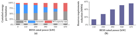 In Figure 13a, the allocation of curtailed wind energy to the applicable system constraints is shown for the BESS of different power capacities. The impact of the dynamic limitation is drastically reduced as more powerful batteries are used, while a marked reduction in the spinning reserve requirements compared to the base scenario is noted in Figure 13b, as the enhanced wind generation dependability, afforded by the introduction of dispatchable storage, poses a need for reduced system reserves (see constraint (14)).
