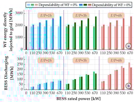 Effect of WF enhanced dependability through the BtM storage. (a) Annual WF energy directly injected to the NII system and (b) annual energy discharge of the BtM BESS, for BESS configurations of 1 h, 3 h, and 6 h durations.