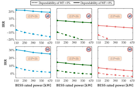 The additional revenue due to the integration of storage in the WF, quantified in Section 5.2.2, is not sufficient to ensure the viability of the respective investment, as shown in Figure 11a, leading to negative IRR values. Nevertheless, this additional revenue does reflect the full benefits for the system achieved through the introduction of behind-the-meter storage in the WF. In this vein, the BESS contribution to system adequacy, quantified in Section 5.2.3, corresponds to a substantial avoided cost of investing in equivalent thermal capacity, whose annual fixed cost should, in principle, be credited to the WF incorporating BtM storage. Under this assumption, the IRR of the BESS investment clearly improves, as shown in Figure 11b, where the 110 kW/1 h or 2 h as well as the 250 kW/1 h BESS configurations constitute feasible investments. In this analysis, the annualized equivalent fixed cost of conventional generation is considered at EUR ~177/kW [10].