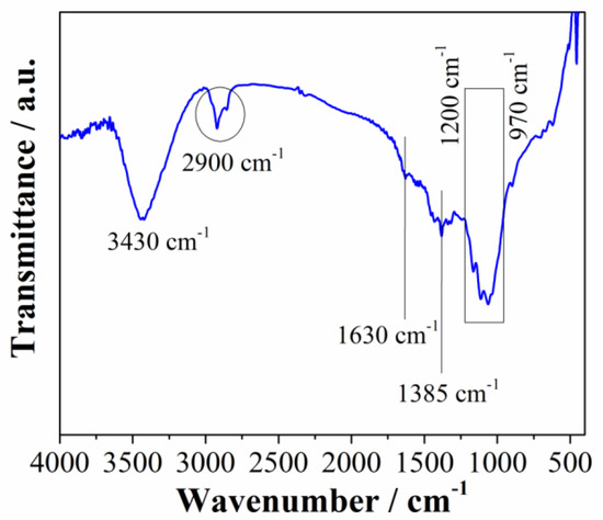To further investigate material surface chemistry, FTIR analysis was performed (Figure 3). As shown in Figure 3, a series of adsorbing peaks appear in the investigated regions of both materials, indicating that materials have dominantly oxygen surface functional groups. The peak at 3430 cm−1 belongs to OH stretching vibrations and it appears in all spectra. The two peaks at 2919 cm−1 and 2850 cm−1 correspond to the vibrations of the C-H groups. The peak observed at 1630 cm−1 is attributed to the stretching vibrations of C=X (where X=C, O) [34]. These C=O vibration bands could be further attributed to carboxylic groups; however, the carbonyl and lactone groups are mostly responsible because they are stable at lower temperatures and the material was prepared at 700 °C [35]. In addition to the mentioned vibrations, this peak is also attributed to the stretching C=N vibrations, and the distinct peak at 1385 cm−1 could be identified as C-N vibration modes [36]. This indicates that nitrogen functional groups are also present in the carbon structure in addition to the oxygen functionalities. The nitrogen atoms originate from the carbon precursor, i.e., choline, which contained nitrogen in the structure. The broad band in the region between 1200 and 970 cm−1 can be the consequence of two overlapping bands: C-O and C-N banding vibration peaks. The C-O stretching vibration peak (from COOH) typically appears between 1120 cm−1 and 1160 cm−1 [37,38], while the C-N band is usually centered around 1040 cm−1 [36].