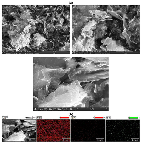 The morphology of Carbw was examined by scanning electron microscopy (SEM) combined with energy-dispersive X-ray spectroscopy (Figure 4a,b). Micrographs (Figure 4a) showed a large number of 3D network structures with interconnected sheets. These interconnected sheets showed nanometer thickness.