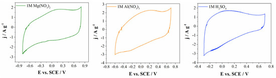 Material Carbw was further selected to investigate energy storage, since it has developed a microporous structure and high surface area value. In the first step, energy storage behavior was not only investigated in conventional 1M H2SO4 electrolyte but also in aqueous electrolytes containing multivalent ions, such as Al3+ (1 M Al(NO3)3 electrolyte) and Mg2+ (1 M Mg(NO3)2 electrolyte). Figure 5 represents the cyclic voltammograms of the Carbw electrode material in the three mentioned electrolytes at a scan rate 20 mV s−1. Comparisons of cyclic voltammograms indicate the dependence of the charge storage on the type of electrolytic solution. As can be seen from Figure 5 and Figure S2 (Supplementary Materials), the charge storage was most pronounced in electrolytes containing multivalent cations, i.e., Al3+ and Mg2+, when compared with the commonly used 1M H2SO4 electrolyte.
